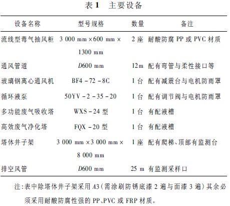首先必須根據四只酸洗槽敞口面積,計算實際需要的NOx 廢氣排風量,以及整個通風管道、吸風罩、凈化塔的阻力損失,選用通風機的排風量和風壓損失。同時還應考慮風量、風壓的附加安全系數[4]是設計通風凈化系統的重要技術指標。本系統處理 NOx 廢氣量為12 000m3 / h。該工程使用的主要設備見表1。