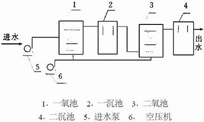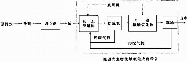 該廠原購置安裝的一套地埋式生物接觸氧化設備, 經調試運行, 出水BOD5≥120 mg/L , 無法達到地方污水排放標準. 原有工藝流程如附圖.