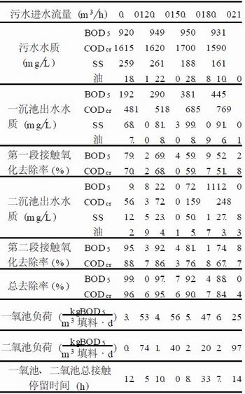 當第一段生物接觸氧化有機負荷為4. 56 kg2 BOD5 /m 3 填料·d 時, BOD5 從949 mg/L 降至290 mg/L , 去除率為69. 4% , CODcr從1 620mg/L 降至518 mg/L , 去除率為68. 0% , 再接第二段生物接觸氧化, 負荷為1. 40 kgBOD5 /m 3 填料·d, 則 BOD5 和CODcr分別降至2. 0mg/L 和72. 0mg/L , 去除率分別為92. 4%和86. 3% , 全過程BOD5 的去除率為97. 7% , CODcr的去除率為95. 6% , 出水全部指標達到排放標準。有機負荷過大時, 出水難以保證達標; 有機負荷過小時, BOD5, CODcr的去除率雖有進一步提高, 但在工程設計中處理設施容積將大幅度增加, 是不經濟的. 同時, 當一氧池負荷為4. 56 kgBOD5 /m 3 填料·d 時, 一沉池出水BOD5 為 290mg/L , 能滿足工廠現有成套設備的原設計進水要求, 因此該組數據可以作為工程設計的依據.