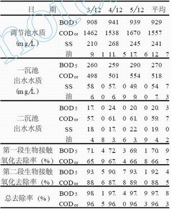 工程改造過程中, 原污水處理設備保持運轉. 新增一氧池竣工后, 開始調試. 首先按照小試研究的方法, 在一氧池填料上掛膜馴化, 然后再將一氧池與原設施連通, 投入運轉. 運轉2 個月后, 經生物相觀察表明, 一氧池生物膜主要的菌膠團、絲狀菌、鐘蟲、枝蟲等原生動物, 二氧池生物膜出現輪蟲、線蟲等大量后生動物, 說明二段生物接觸氧化過程是正常的.表2 為正常運行后連續3 d 水質監測的結果.