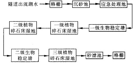2.1 工藝流程 星云湖出流生態凈化工程選擇穩定塘/植物碎 石床濕地工藝,具體工藝流程如圖2所示。
