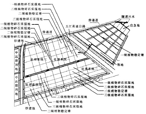 工程從上到下分為三個片區(見圖3):出流口 與高速公路間為一個片區,包括應急池和一級植物 穩定塘,處理規模按中遠期20×10 m /d設計;高 速公路與進鎮公路間為第二個片區,一區出水經輸 水涵洞到二區進行處理,設置4大處理系統,包括一 級植物碎石床濕地、二級植物碎石床濕地、二級生物 穩定塘、三級植物碎石床濕地和砂濾池;進鎮公路與 九溪河之間為第三個片區,作為中遠期處理用地,布 置與二區相近。