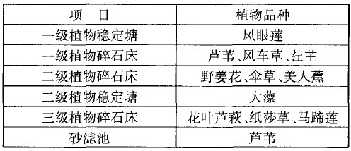 在利用植物進行水質凈化時,植物的選擇顯得 尤為重要。選擇原則如下:首先要盡量選用當地植 物品種;其次是要根據各處理池的工藝要求進行選 擇,人工碎石床濕地的大部分濕地植物為草本植物, 或采用喬木/草本混合種植方式,盡量豐富植物的結 構類型,以提高植物的凈化能力。在生物穩定塘中, 主要使用漂浮和浮葉植物,以增加塘系統的凈化效 率。 各處理池的植物選擇見表2。