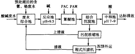 根據實際廢水特征及處理要求。本工程設計采 用的處理工藝見圖1。含氰、含鉻廢水分別進行預處 理,預處理工藝見圖2、圖3。預處理后的含鉻、含氰 廢水排人廢水綜合池中與酸堿廢水混合。將混合廢 水泵至堿化反應池加堿調節pH=9.5后,流至絮凝 池進行絮凝反應,反應完成后排至沉淀池中沉淀,出 水經調節pH后排放。沉淀污泥送人廂式壓濾機脫 水,泥餅外運,濾液返回廢水綜合池。