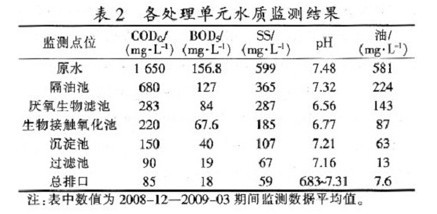 該工程于2008年8月開始設計,建設時間為3個月,經過3個月的運行調試,該中藥廠生產廢水處理系統運行穩定。各治理單元水質監測結果見表2。