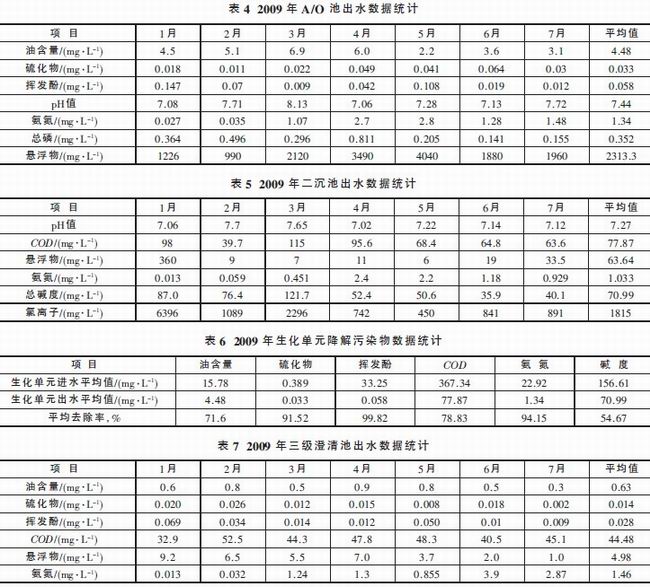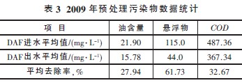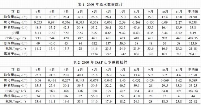 2009 年,污水場二期原水數據統計見表1;DAF 單元運行效果見表2~3;生化處理單元運行效果見表4~6;深度處理單元運行效果見表7 和表8。