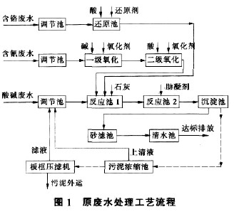 一期廢水處理系統中, 廢水分為含氰廢水、含鉻廢水、酸堿廢水3 類進行處理。分類處理后3 股廢水混合加藥沉淀, 然后過濾排放。