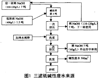 生產三濾紙時,第一道工序是用濃燒堿溶液處理漂白針葉木漿。一天三班連續生產,每班用上一班回收的稀堿7噸,堿濃度1 10~120g/L。每班加新堿1.5t,堿濃度400g/L。原來工藝是一次擠壓,現增設一道二次擠壓:先將一次擠壓后漿加水稀釋至7%~9%,再雙輥擠壓出堿水7~8噸 (堿濃度60g/L),總量相當于濃堿1t,此堿水外運被其它廠作中和用堿水。這樣,每班實際有 0.5t的新濃堿進入廢水。
