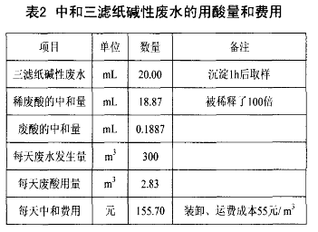 4.2利用該公司鄰近企業的廢酸對生產廢水進行中和,以廢治廢,保護了環境,又節省了中和費用。處理每天生產產生的300m。堿性廢水,需要廢酸2.83m。,可達到中和的目的,中和費用為 155.70元。