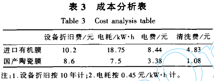 無機陶瓷超濾膜與有機超濾膜處理1 m3濃含油廢水相比成本分析見表3。