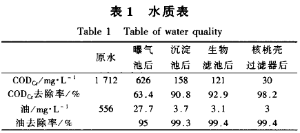 采用生物處理,則可以將水中的有機物(碳氫化合物)代謝分解為無害的水和二氧化碳。根據軋鋼廢水的特性,將“倍加清”生物定向菌種應用于曝氣池及生物濾池處理稀含油廢水取得了成功,通過生物曝氣池提高廢水的可生化性,最終通過生物濾池及核桃殼過濾器,確保了出水水質。實際運行油及COD 去除情況如表1。