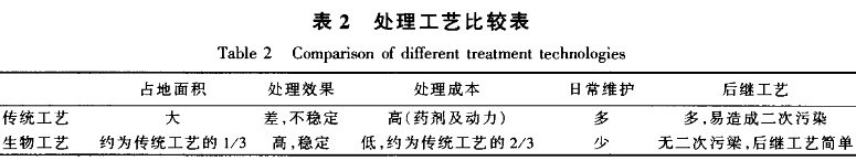 曝氣一沉淀一生物濾池工藝與傳統處理工藝比較見表2。其最大優點是減少化學藥劑的投加,無二次污染物產生,處理效果穩定。