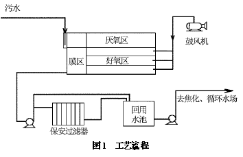本工藝膜生物反應器根據生物的工藝要求,建有兩個生物反應區,其中一個為好氧區( 硝化池) , 另一個為缺氧區( 反硝化池) 。因此除了具有有機物降解功能外,還具有硝化和反硝化作用,提高了系統對NH3 - N的去除能力。