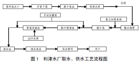 利津水廠地處東營市利津縣城以北約15km處,隸屬勝利石油管理局供水公司管理。該水廠于1992年10月投產,設計規模 5萬m3/d,采用“脈沖澄清池+普通快濾池”的常規處理工藝,以黃河水為水源。