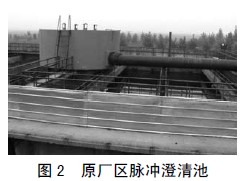 脈沖澄清池共設2座,混凝區上升流速為1.2mm/s,清水區上升流速為1mm/s,進、出水管均采用虹吸管,設計濾速為8m/h。加藥系統采用重力投加,未設助濾劑投加設施。加氯系統采用濾后加氯采用手動加氯機人工調節加氯量。圖2為脈沖澄清池現場照片。