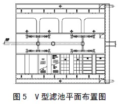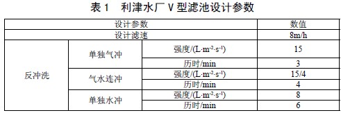 V型濾池南北方向布置,平面尺寸為30.85m×25.9m。雙排布置,每格濾池的有效面積為 2×6.3×2.8=35.28m2。每格濾池安裝18塊933mm×1050mm標準濾板。采用均質石英砂單層濾料:有效粒徑為0.9mm,不均勻系數K10=1.40(D80/D10),厚度為1200mm。承托層采用粒徑為2.0mm的石英砂,厚度為 100mm。進、排水閥采用氣動不銹鋼方形閘門,并通過流量調節閥調整濾池的水位基本保持不變,避免濾層出現負壓,并達到恒水位過濾的目的。利津水廠V 型濾池設計參數如表1所示,平面布置圖如圖5所示。