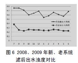 從圖6可以看出,2009年7 月新系統運行后,經過2個月調試運行,濾后水濁度基本穩定在 0.25NTU左右,其出水濁度遠遠低于老系統。