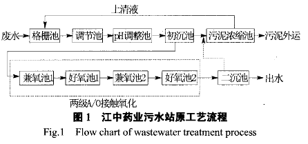 廠方主要產品為健胃消食片、復方草珊瑚含片。中成藥主要生產過程為:中藥原材料切片煎煮、濃縮為浸膏,經噴霧干燥后制成干膏粉,再與輔料按比例混合后壓片、薄膜包衣成型。廢水主要來源于提取車間的原料濃縮廢液、煎煮濃縮容器清洗水、噴霧干燥塔清洗水和多功能車間壓片、包衣容器清洗,各車間地面沖洗水及人員清潔用水也一并混入生產廢水。另外生化車間利用干蚯蚓提取蚓激酶,水泡磨漿和離心過濾中都有廢液產生,同時提取樹脂再生用酸堿溶液也直排進入污水管道,雖然產量不大,但在其他車問廢水量小時會對廢水pH造成較大影響。