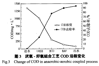 穩定運行期間厭氧.好氧工藝沿程COD變化如圖3所示。