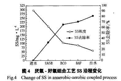 在UASB正常運行情況下,厭氧平均出水 COD 300 mg/L,后續好氧工段處能在低有機負荷條件下運行,整個系統COD總去除率超過94%。值得注意的是當廢水流經UASB后COD的累積去除率就已經接近80%,說明在UASB—BCO—BAF的厭氧一好氧組合工藝中,UASB厭氧反應器起主導作用。因此,只有保障UASB穩定運行,整個系統才能獲得理想的處理效果。