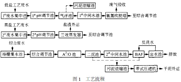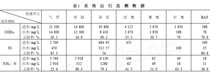 從工程設計及運行結果來看,空氣吹脫法可以大幅度降低較高濃度的氨氮,同時結合A2 / O 工藝, 具有較好的氨氮去除效果;多效蒸發可以去除大量鹽分及高沸點有機污染物,降低污染負荷;BAF 同時具有生物氧化和過濾的雙重效果,出水可達《上海市污水綜合排放標準》(DB 31/ 199 —1997) 二級標準。