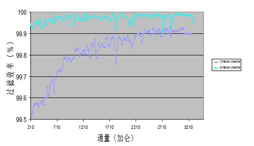 此外,由于濾芯的纖維組織疏松,高空隙率增加了雜質的容截量,因此濾芯具有深層三維過濾效果,屬復式深層截留,即較大的顆粒雜質被截留在纖維表面,而細微顆粒則被捕捉于濾材深層中,因此濾芯的過濾效率具有梯度過濾效果。如圖五為3M CUNO高流量濾芯HF004型號濾芯的過濾效率數據,HF004宣稱精度和過濾效率為在5微米時為99.9%,但是從圖五中可以看出,HF004濾芯在測試過程中,5微米的過濾效率大于99.9%,而且對3微米顆粒雜質的過濾效率也達到99.5%以上。那就意味在實際應用中,3M CUNO高流量濾芯可以過濾比宣稱精度還小的固體顆粒雜質。