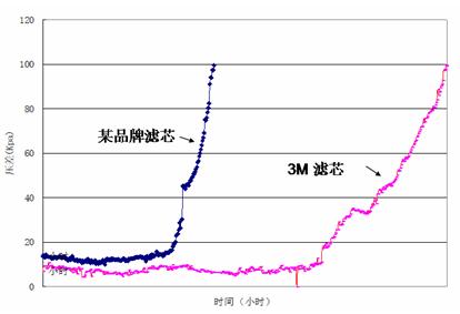 從圖二中還可以看出,在過濾初始階段,二者壓差增加都非常低而且非常平穩,但過濾一段時間后,某品牌濾芯出現拐點,壓差陡升,而且隨時間的增加壓差增加非常迅速,而PolyKLEAN濾芯的壓差增加一直非常平穩,在濾芯使用壽命達到總體壽命的2/3時,壓差才開始逐步增加,并沒有出現明顯的拐點,此數據和我們濾芯的實驗室數據非常吻合。造成二者的在線測試的數據差異的原因在于:雖然二者都是深層過濾濾芯,但是某品牌濾芯孔徑較少,容污量低,濾芯一旦被一定粒徑的固體顆粒雜質堵塞,濾芯內部的孔徑迅速被堵死,導致壓差迅速增加,這就是發生壓差發生拐點的原因之一。而PolyKLEAN濾芯也為深層過濾,但濾芯內部具有“迷宮”式結構,容污量高,因此可以過濾和容納不同粒徑的固體顆粒雜質,從而防止濾芯內部過早被某種單一粒徑的雜質堵死,避免發生了拐點的現象。到達后期(試用壽命2/3后),濾芯內部仍然有一定的空間容納固體顆粒雜質,同時濾芯表面的濾餅層開始發生作用,從而避免了壓差陡升的現象,延長了濾芯的使用壽命。