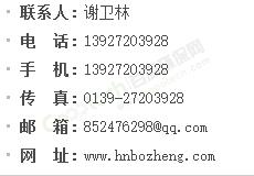 公司誠招區域代理商,聯系人:謝經理;電話13927203928; QQ:852476298。公司網址www.hnbozheng.com