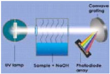 測量原理: 在樣品中注入少量的氫氧化鈉(NaOH),使樣品中的NH4+在堿性環境下完全轉化成NH3,依據氨氣(NH3)對紫外光譜的吸收效應,在光譜圖中用快速傅立葉變換 (FFT)方法提取與氨氣相關的吸收信號,從而測量氨氣的含量,即同時得到了樣品中NH4+的含量。
