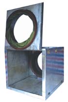 進出風管在箱體進出風口通過園變徑管裝消聲器,消聲器有微孔板單空腔、微孔板雙空腔、微孔板阻抗復合、阻性消聲器四類,消聲器在控制氣流未端送風噪聲的同時控制管壁幅射噪聲污染。(隔聲箱可隨風機倒或按在墻中。)