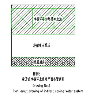 通常情況下,簡單的濁循環水處理的平面布置方式有兩種,一是將冷卻塔、冷卻塔下水池、循環水泵場可集中設在一起,其旁側可設置沉淀池;二是將冷卻塔、冷卻塔下水池、循環水泵場、沉淀池、附屬用房等呈一字形設置。附圖4為一般濁循環水處理平面布置。
