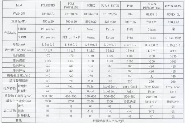 進口濾料、濾袋技術指標