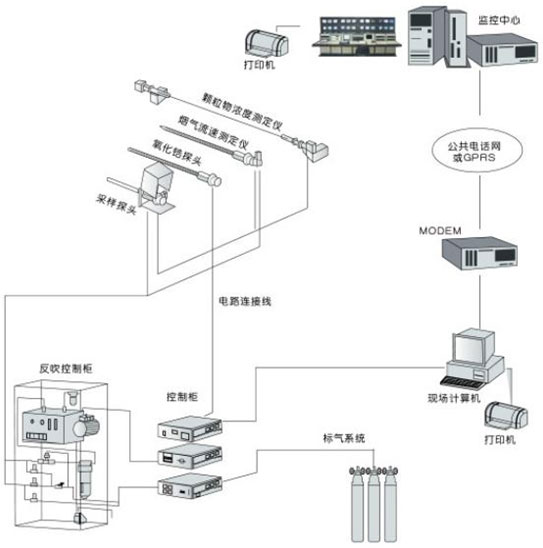 該系統主要包括:氣態污染物監測子系統、煙塵(顆粒物)濃度監測子系統、煙氣參數子系統、數據采集數據處理及遠程通訊子系統。