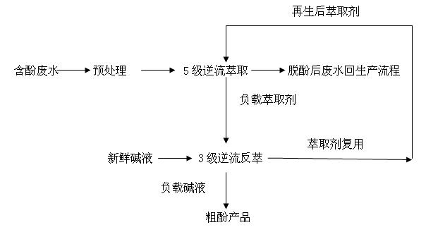 本方案采用的工藝大體分為兩大步驟;即:預處理除去廢水中的油和懸浮物;多級逆流萃取分離(二級處理)脫除廢水中的酚類物質;處理后的廢水進入生產工序回用或生化處理達標后排放。