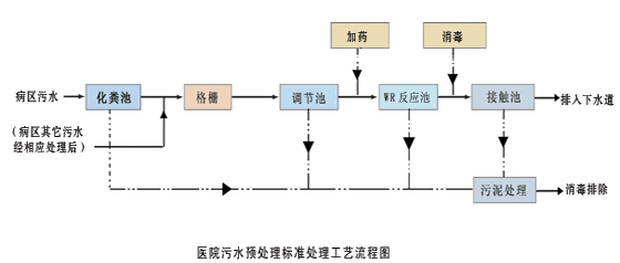 當醫院污水排放到有污水集中處理廠的城市下水道時,執行《醫療機構水污染物排放標準GB18446-2005》中預處理標準;以解決生物性污染為主,采用一級處理流程