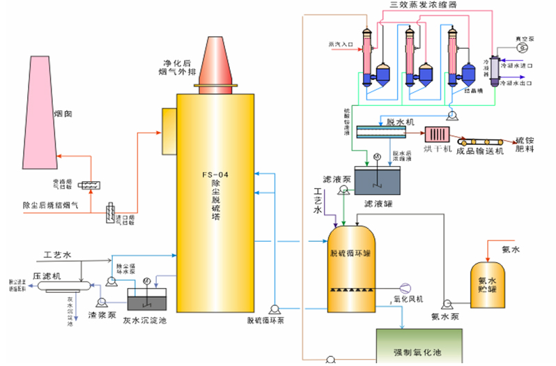 氨法脫硫后的產物,主要有氨—酸法、氨—肥等。氨的水溶液呈堿性,能夠吸收煙氣中的SO2,而達到煙氣脫硫的目的,吸收過程中是利用(NH4)2SO3-NH4HSO3溶液對SO2的循環吸收、凈化煙氣,然后以不同的方式處理吸收液的過程。其吸收工業原理如下: