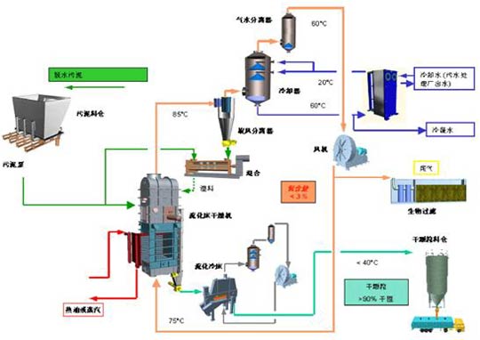 干化機系統和冷卻器系統的流化氣體均保持在一個封閉式防塵氣體回路。起流化作用的循環氣體將污泥細粒和蒸發的水分帶離流化床干化機。污泥細粒在旋風分離器內進行分離,而蒸發的水分在一個冷凝換熱器內采用直接逆流噴水方式進行冷凝。蒸發的水分本身以及其他循環氣體在85℃左右的溫度水平冷卻到60℃左右,然后冷凝,冷凝下來的水離開循環氣體,排至廠區污水管道系統。來自冷凝器的氣體中含有微小水珠在一臺汽水分離器內進行分離。通過2臺風機將干凈而冷卻的流化氣體再循環到干化機。其中,1臺風機通過變頻器適當調節循環氣體流量。流化床冷卻器回路內的循環以同樣方式處理,但無旋風分離器,因為無污泥細粒。此外,冷卻器氣體回路中的冷卻洗滌器用冷卻水冷凝氣體。汽水分離器之后回路氣體只要用一臺簡單的小型風機進行壓縮,然后供應給流化床冷卻器。干化污泥由冷卻回路氣體冷卻到低于40℃。冷卻回路中的氧含量由一臺氧分析儀連續測量。通過連續補充氮氣,使冷卻氣體保持低氧環境。整個系統工藝過程如圖2所示: