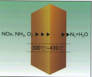 將還原劑(氨或尿素)均勻混合到煙氣中,在300~430℃溫度區間通過蜂窩形催化劑,與煙氣中的氮氧化物發生還原反應,達到脫除目的。