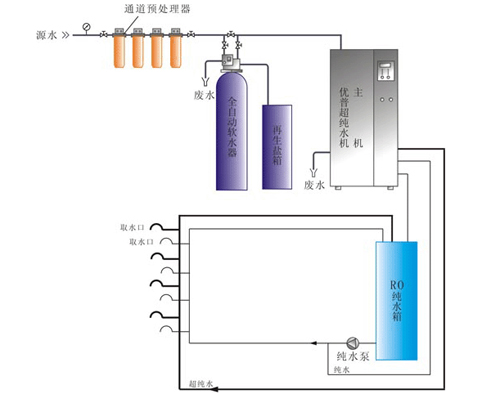 ---->加壓泵---->EDI---->超純水箱---->變頻泵(一用一備)---->拋光混床---->一般終端取水口---->精密過濾器