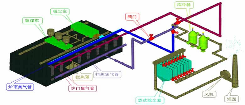 (2)在爐頂設煙塵收集車與裝煤車配合工作,利用地面站所設風機所產生的吸力,將裝煤、出焦產生的污染氣體吸集后,通過燃燒、消解苯并芘(Bap)并冷卻后,通過輸送總管進入空冷器,空冷至100℃后進入干式除塵機組,除塵后經風機通過煙囪排入大氣。 本系統達標穩定,適應于4.3米以上的焦爐,對焦爐所要求的有組織排放和焦爐無組織排放的各項指標均低于國家環保二級標準的限值。