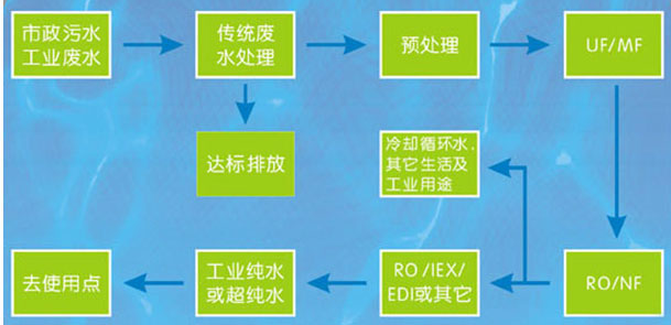 在廢水回用領域,本公司推廣使用膜法廢水深度處理及回用技術方面取得了豐富的理論及實際運行經驗。公司已經完成了多套廢水深度處理及回用工業化項目。針對用戶的具體情況,根據各種濾膜的不同性能,設計出最合理的技術方案,滿足客戶的相應需求。