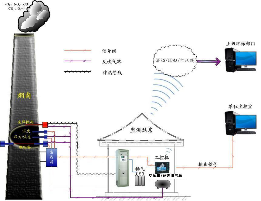 煙氣排放連續監測系統適用于各種鍋爐連續廢氣排放量的監測,采用直接抽取法,可以連續在線監測顆粒物的濃度、二氧化硫(SO2)濃度、氮氧化合物(NOX)濃度、氧氣(O2)含量、煙氣溫度、煙氣壓力、煙氣流速,還可以增加一氧化碳(CO)、二氧化碳(CO2)、氯化氫(HCL)、氟化氫(HF)、氨氣(NH3)、碳氫化合物(CHX)、濕度等參數的測量。其控制計算機可以將所測到的數據進行處理和存貯;可通過網絡與上級環保部門的計算機連接,環保部門可以方便、快捷地調用監測數據。企業內部可以通過局域網,根據訪問權限對數據庫進行操作,如讀取數據、修改狀態參數,甚至對系統進行直接操作。由于采用直接抽取法測量煙氣中的污染物濃度,系統可以用標準氣對分析儀進行在線標定,保證監測數據的準確性。氣體分析采用的是非分散紅外吸收法;含氧量的監測采用壽命可達十年的順磁氧分析儀器。