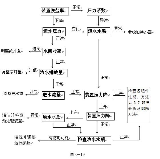裝置運行中發生異常的現象,主要通過脫鹽率、回收率、壓力降三個參數變化來反映。究其原因,往往是復雜的、多方面的。可能是設備原因,也可能是進水水質變化的原因,也可能是RO膜組件的原因。因此在原因調查時,應細致、有條不紊。以下給出檢查流程及有關說明,供參考。