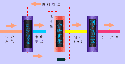 吸附工藝 SO2+1/2O2=H2SO4 解吸再生 2H2SO4+C=2SO2+CO2+2H2O |