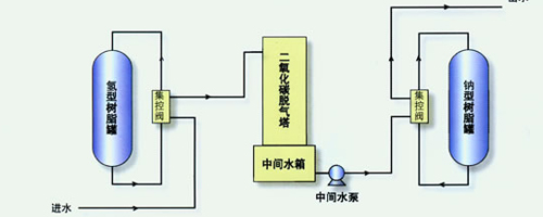 反應生成的二氧化碳經脫氣塔排掉,其出水再經鈉罐中的強酸性鈉型陽離子交換樹脂除去非碳酸鹽硬度。