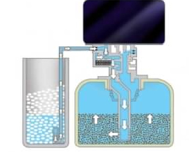 原水在一定的壓力(0.2-0.6Mpa)、流量下,通過控制器閥腔,進入裝有離子交換樹脂的容器(樹脂罐),樹脂中所含的Na+與水中的陽離子(Ca2+,Mg2+,Fe2+……等)進行交換,使容器出水的Ca2+,Mg2+離子含量達到既定的要求,實現了硬水的軟化。