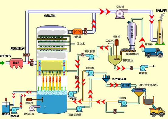 該工藝的特點是使用了噴射鼓泡裝置。在噴射暴氣反應池中,煙氣通過噴射器直接噴散到洗滌液中,取消了漿液噴淋裝置和再循環裝置。經處理后的煙氣經過煙氣升氣管進入上層的混氣室,然后經除霧器后由煙囪排出。該工藝取消了復雜的漿液再循環系統,簡化了工藝過程,也降低了能耗,因而使成本投資和運行費用都有所減少。