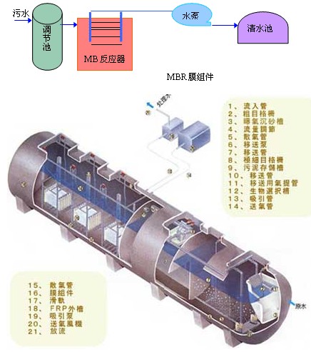 膜生物反應器(membrane biological reactor)是將膜分離技術與生物技術相結合而形成的一種新型、高效的污水處理技術。膜的作用是代替二沉池,將生物體截流在生物反應器中,通過保持高的生物體濃度和截流高分子量的溶質,促使進水有機物的礦化,而無需進行后續處理。與常規技術相比,具有以下特點: