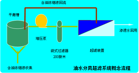 本系統處理的水為含油廢水,系統包括油水分離器、管式超濾、PH調節系統、壓濾機及離子交換器。