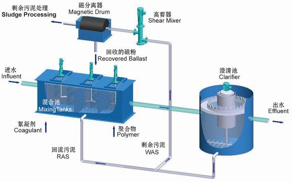 3、加載物磁粉損耗低: CoMag工藝的加載物磁粉比砂礫重(加載物磁粉比重 5.2 ,砂礫比重 2.7-3.0 ),而且目數大,降低了攪拌器、泵和其它組件的磨損。 另外,其在整個系統內循環使用,回收率高,損耗量極低。